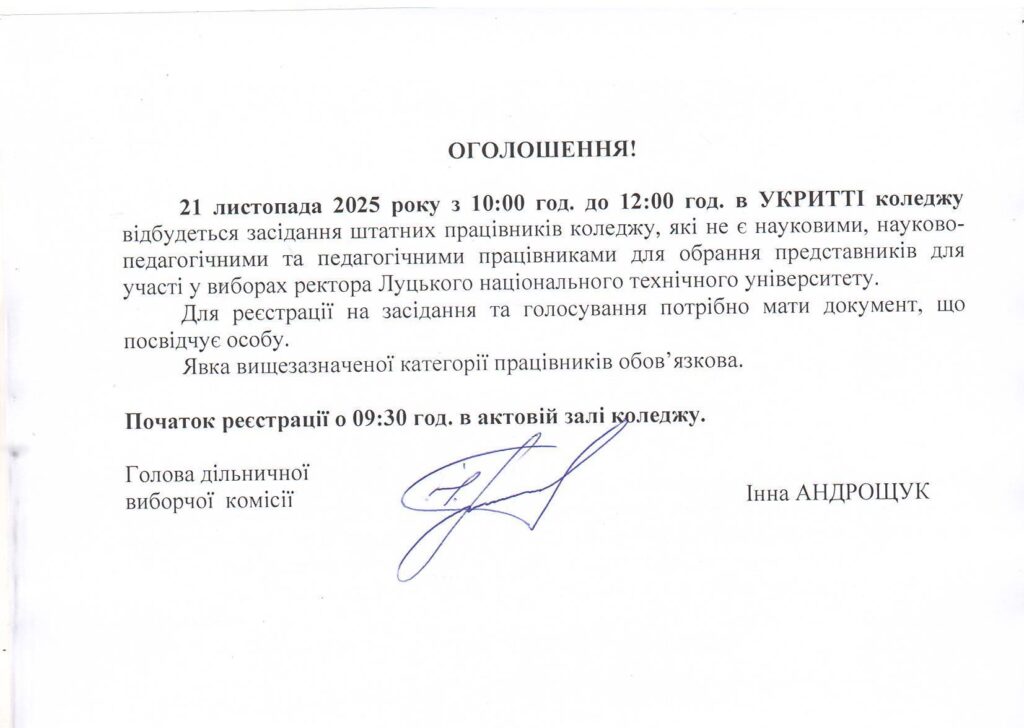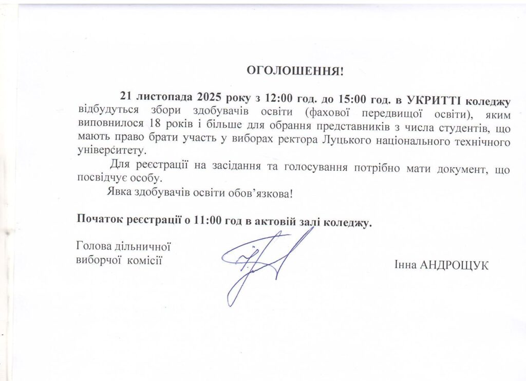 Вибори проводяться з 9:00 до 15:00 год. на виборчій дільниці за адресою: 43023, м. Луцьк, вул. Конякіна, 5; (укриття головного корпусу коледжу).