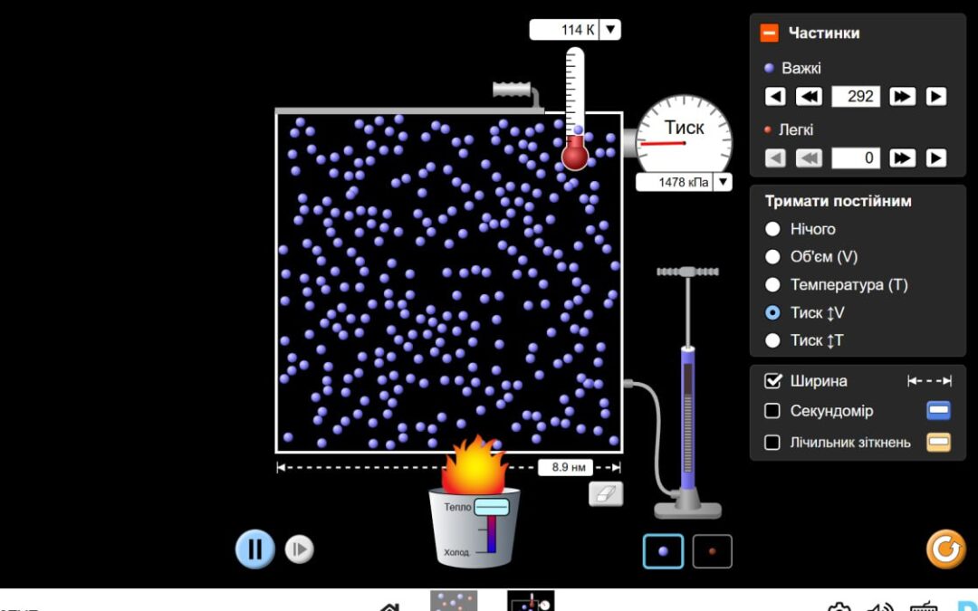 Під час заняття здобувачі освіти досліджували ізотермічний, ізобарний та ізохорний процеси, аналізували зміну основних параметрів газу та спостерігали закономірності, що лежать в основі цих фізичних явищ. Для проведення дослідження було використано інтерактивну симуляцію PhET Interactive Simulations, яка дала можливість моделювати експерименти у віртуальному середовищі.